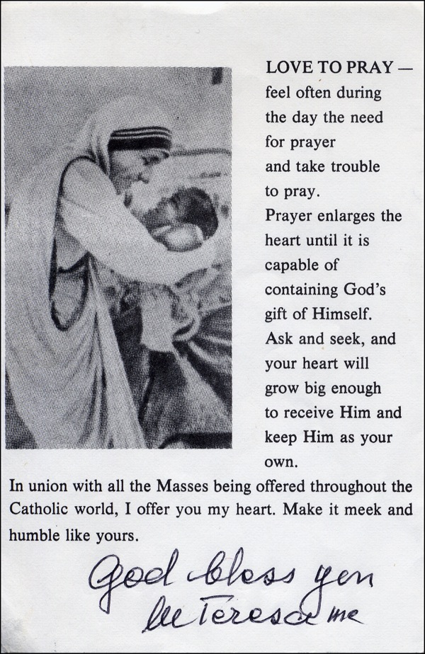Prayer sheet, 3.5 x 5.5, with a photo of Mother Teresa, cradling a young child, signed in black ink “God bless you, M Teresa M C.” The printed message reads, in part: “Love To Pray - feel often during the day the need for prayer and take trouble to pray.” In fine condition. R&R COA.