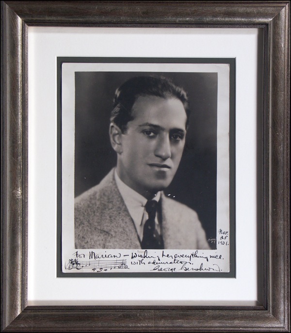 American composer who melded the jazz idiom with classical music forms in a number of timeless orchestral and stage works, including Rhapsody in Blue and Porgy and Bess. Striking vintage 7.75 x 10 portrait, signed and inscribed in the lower border, “For Marian—Wishing her everything nice, With admiration, George Gershwin, Nov. 25, 1931.” At lower left Gershwin also pens the famous theme from Rhapsody in Blue. The consignor, a relative of the original recipient, notes that “Marian” was Marion Bardell (born Fern Maxine Salyer, aka Billie Salyer), an entertainer who dated Gershwin in the early 1930s. Bardell appeared on Broadway and in a handful of films, including the 1933 Laurel and Hardy short “Me & My Pal.” Matted and framed to an overall size of 13.5 x 15.7. In fine condition, with three tiny spots of skinning near neck (which could be professionally retouched), mild corner creases, and two small areas of discoloration in the lower border, not affecting the signature or quotation. COA John Reznikoff/PSA/DNA and R&R COA.