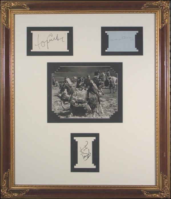 Lot of three ink and felt tip signatures on individual slips and cards: Laurence Olivier, Tony Curtis, and Kirk Douglas. All three are elaborately matted and framed together with a photo to an overall size of 23.75 x 27.5. In fine condition. R&R COA. Oversized. Oversized.