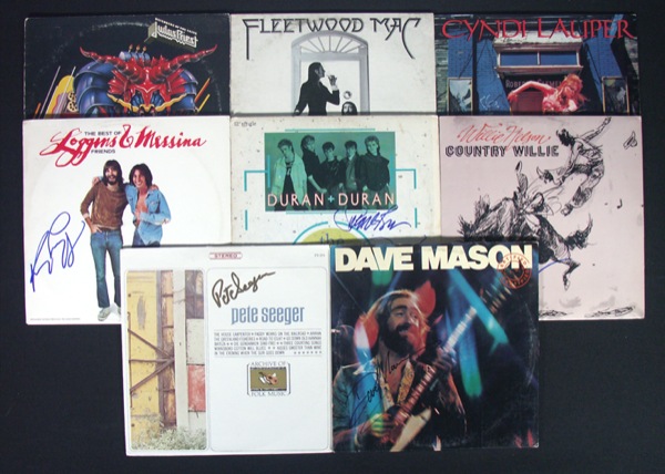 Lot of eight albums, each signed by the artist in blue or black felt tip. Included: Judas Priest’s Defenders of the Faith, signed by Rob Halford; Fleetwood Mac, signed by Lindsey Buckingham; She’s So Unusual, signed by Cyndi Lauper; The Best of Loggins and Messina, signed by Kenny Loggins; The Wild Boys, signed by Simon LeBon and Roger Taylor; Country Willie, signed by Willie Nelson; Certified Live, signed by Dave Mason; and Archive of Folk Music’s Pete Seeger collection, signed by Pete Seeger in gold ink. The records are included. In overall fine condition, with usual age and handling wear, visible rings of wear to a few. R&R COA.