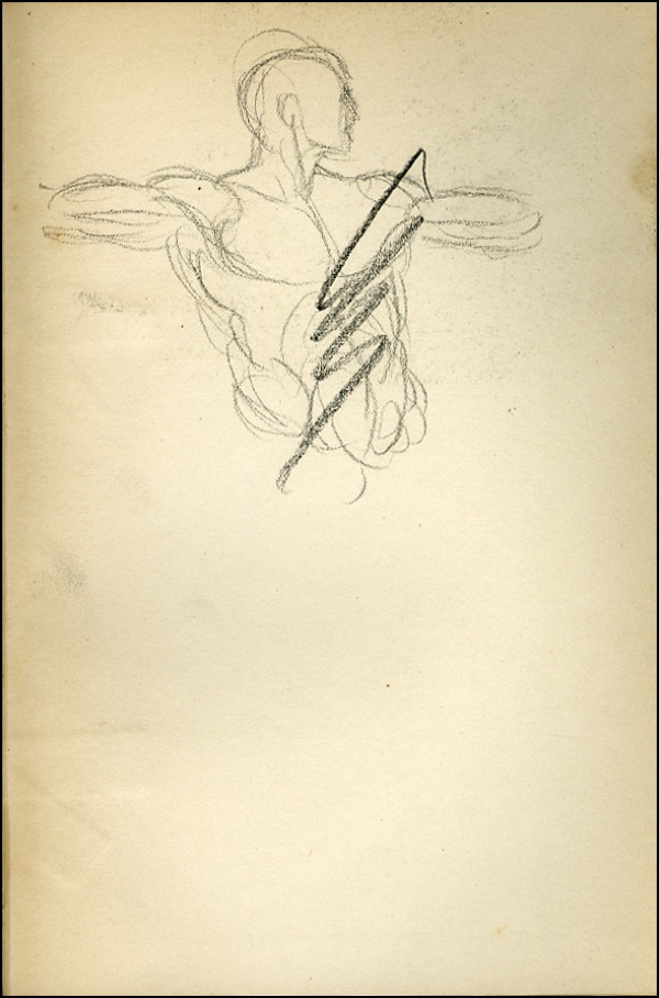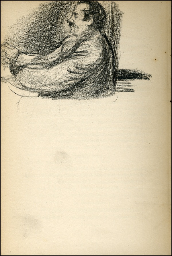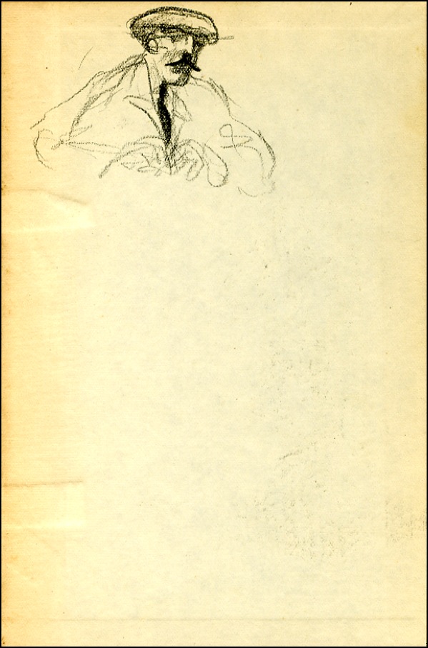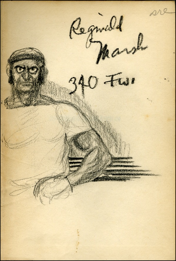 American painter whose works, such as Why Not Use the 'L? and The Bowery (both 1930), depict life in New York City. Six vivid crayon sketches (the first is boldly signed in black crayon) on the first free end, last couple, and inside back cover of the book Societal Evolution, hardcover, 5.5 x 7.5, by Albert Galloway. Sketches depict a muscular man wearing a close-fitting cap and with his left hand on his hip; a suited, moustached man in profile; a figure of a shirtless, muscular man; a full-length sketch of a moustached man wearing an overcoat (signed “Marsh Spaghetti” in pencil above it); a small face looking to the left; and a man in a jacket and tie, wearing a moustache and a beret. In very good condition, with toning and a bit of soiling to the pages, expected wear to the covers. R&R COA.