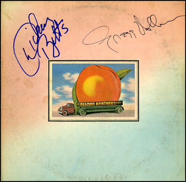 Eat A Peach album signed on the front cover in black felt tip by Gregg Allman and in blue felt tip by Dickey Betts. In very good condition, with ‘ring of wear’ to covers, a few small edge separations and a small pencil notation to top right. The record is not included. COA Roger Epperson/PSA/DNA and R&R COA.