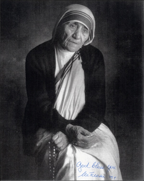 Striking 8 x 10 linen-finish cardstock photo of a pensive Mother Teresa, signed in blue ink, “God bless you, M. Teresa MC.” Signed Mother Teresa photos of this size are increasingly difficult to find. In fine condition. R&R COA.