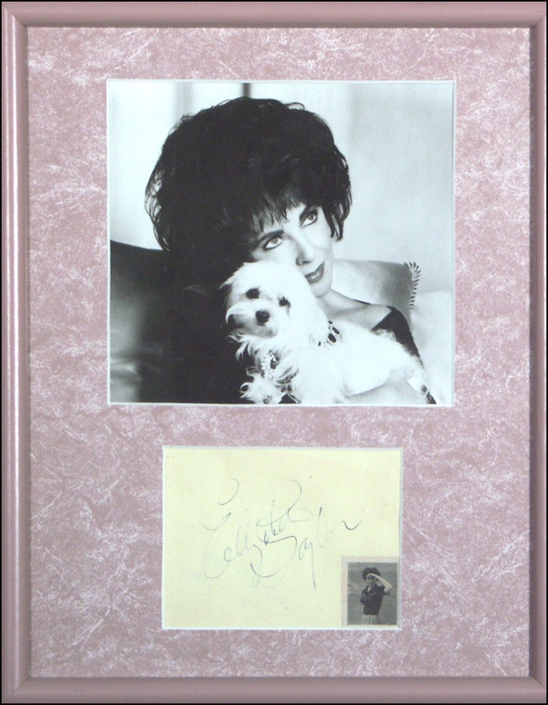Vintage fountain pen signature, “Elizabeth Taylor,” on a yellow 3.75 x 5 album page. Matted and framed with a photo to an overall size of 12 x 15. In fine condition, with slight irregularity to ink flow and small magazine photo affixed to one corner. R&R COA.