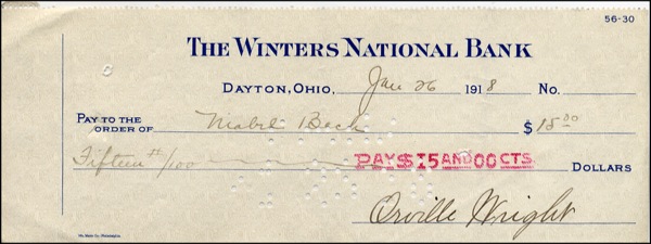Check, 8.5 x 3, filled out in another hand and signed by Wright, payable to Mabel Beck for $15.00, June 26, 1918. In fine condition, with several vertical folds and cancellation holes to body, approaching beginning portion of signature with one inside the “O.” COA John Reznikoff/PSA/DNA and R&R COA.