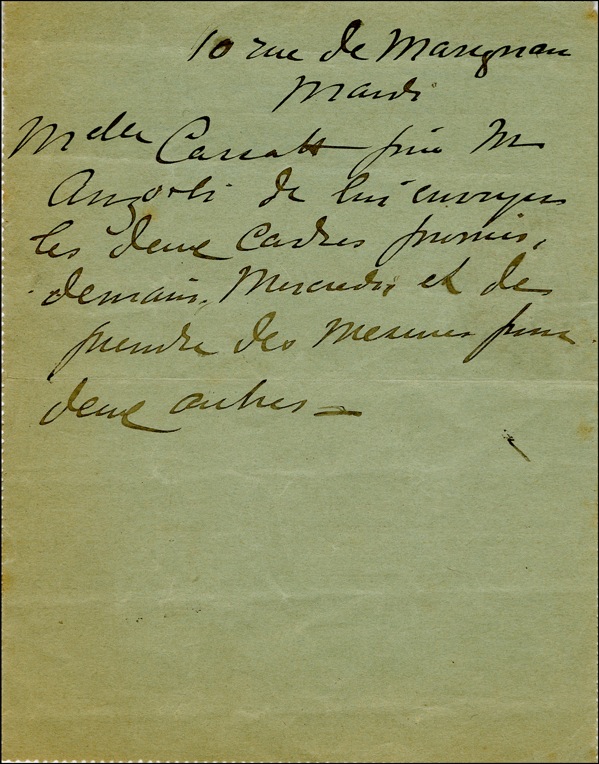 Painter associated with Degas and Courbet and an exhibitor with the Impressionists known for her figure studies and paintings of mothers and children. Rare third person ALS, 4.5 x 5.75, signed “Mlle. Cassat” in the third person, one page, Paris, 1904, in French. Translated in full: “Miss Cassatt asks Mr. Anzoli to be kind enough to send her the two promised frames tomorrow, Wednesday, and to take measurements for two more.” Light wrinkling, otherwise fine. Clearly legible and highly desirable. COA John Reznikoff/PSA/DNA and R&R COA.