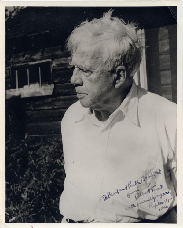 Poet Laureate and American literary icon. Vintage matte-finish 8 x 10 photo, signed and inscribed in fountain pen “To Paul and Ruth Braisted from Robert Frost with friendly regards, Ripton VT 1960.” In fine condition, with a few light edge and corner creases and a few strokes of ink a slightly subtle blue in color to a few letters of signature and inscription. COA John Reznikoff/PSA/DNA and R&R COA.