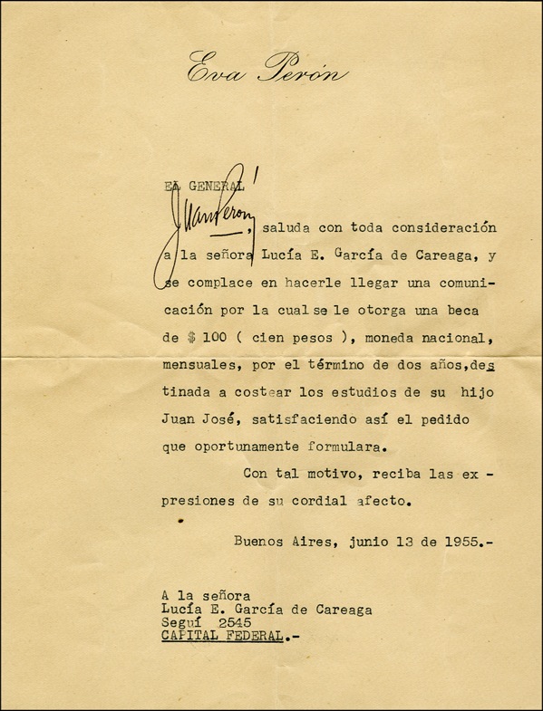 Juan Peron was president of Argentina from 1946 to 1955 and again from 1973 to 1974, his charismatic and ambitious wife, Eva, was the subject of the hit musical Evita. Lot of two items: TLS, signed “Juan Peron,” one page, 6.5 x 8.75, Eva Peron letterhead, June 13, 1955. An untranslated letter, written just three months before his overthrow, seeking donations for the Eva Peron Foundation (Eva died in 1952); and a TLS, signed “Maria Eva D[uarte] de Peron,” one page, 5.75 x 8.75, Eva Peron Foundation letterhead, June 3, 1947. An untranslated letter seeking donations, written a month after her twenty-eighth birthday and a year after her husband assumed office. This full form of Eva’s signature is rather uncommonly encountered. Accompanied by the original mailing envelope from Juan’s letter. In fine condition, with even toning and usual mailing folds to both (not affecting signatures) and tiny corner chip to Eva’s letter. COA John Reznikoff/PSA/DNA and R&R COA.
