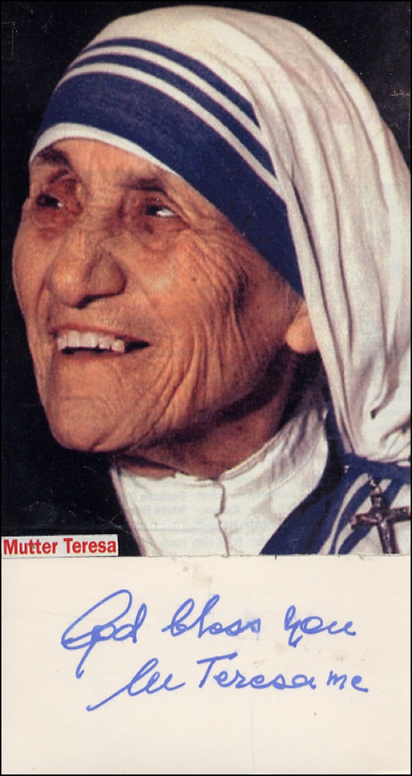 Felt tip signature, “God bless you, M. Teresa mc,” on an off-white 4 x 2.5 card, affixed to the bottom of a 4 x 5.5 color magazine photo. In fine condition, with a slight brush to sentiment and a bit of mild soiling. R&R COA.