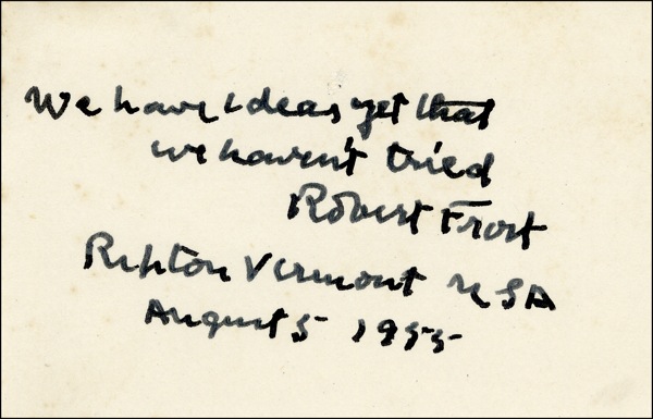 AQS on a 4 x 2.5 off-white card. In full, “We have ideas yet that we have not tried.” Signed at the conclusion, “Robert Frost, Ripton, Vermont USA, August 5, 1955.” In fine condition. COA John Reznikoff/PSA/DNA and R&R COA.
