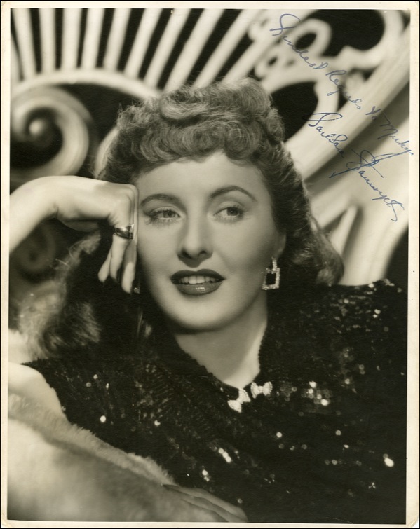 Stunning vintage matte-finish 11 x 14 close-up portrait of the incredibly glamorous Stanwyck in a scene from one of her films, signed and inscribed in fountain pen “Sincerest Regards to Muky.” In fine condition, with corner wear. R&R COA.