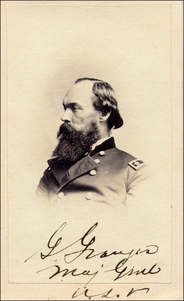 Capable Union army officer whose numerous assignments included serving on McClellan’s staff, directing the army of the Mississippi, commanding the Army of Kentucky, leading the reserve corps at Chickamauga and taking part in the relief of besieged Knoxville. Original CDV of Granger in profile, 2.5 x 4, signed in the lower portion in black ink, “G. Granger, Maj. Genl. U. S. A.” In fine condition. R&R COA.