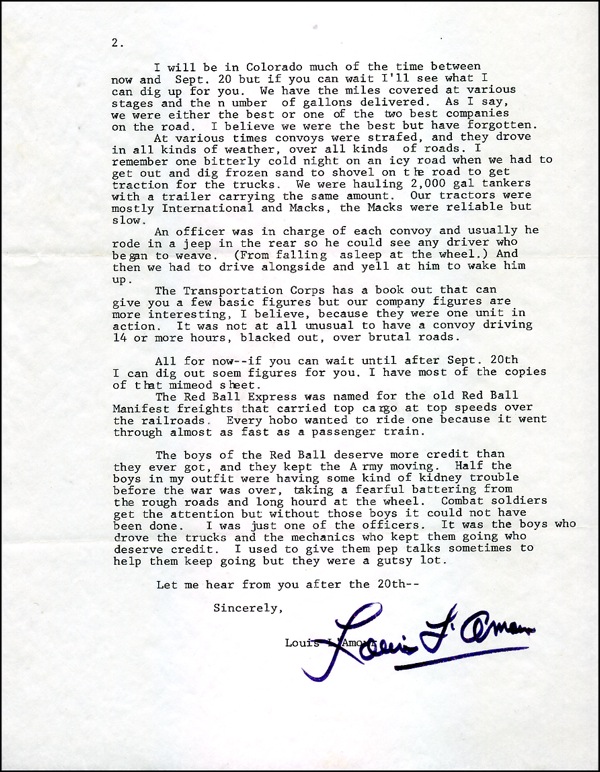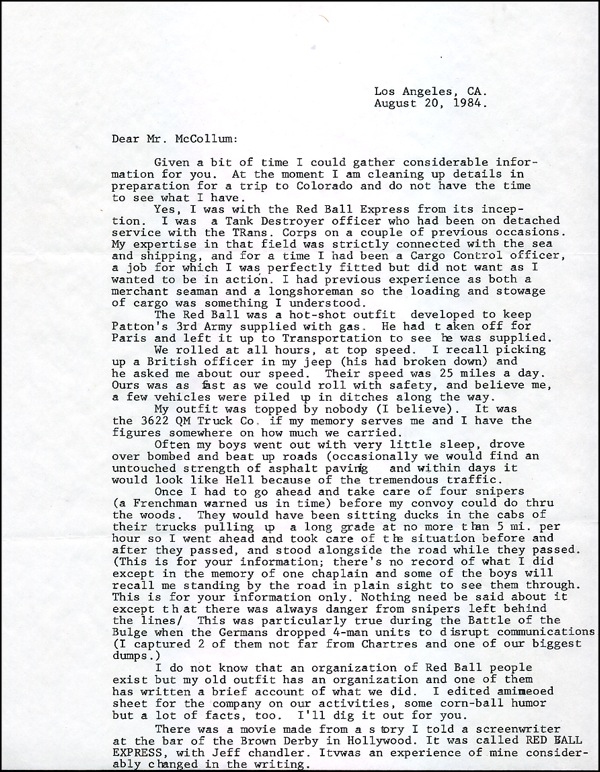 TLS, two pages, 8.5 x 11, August 20, 1984. A lengthy letter to a gentleman regarding his Army experience during WWII. In part: “I was with the Red Ball Express from its inception. I was a Tank Destroyer officer who had been on detached service…The Red Ball was a hot-shot outfit developed to keep Patton’s 3rd Army supplied with gas. Once I had to go ahead and take care of four snipers before my convoy could go thru the woods. They would have been sitting ducks so I went ahead and took care of the situation…(This is for your information; there’s no record of what I did except in the memory of one chaplain and some of the boys). This is for your information only. Nothing need be said about it. The boys of the Red Ball deserve more credit than they ever got…Combat soldiers get the attention but without those boys it could not have been done. I was just one of the officers. They were a gutsy lot.” In fine condition. R&R COA.