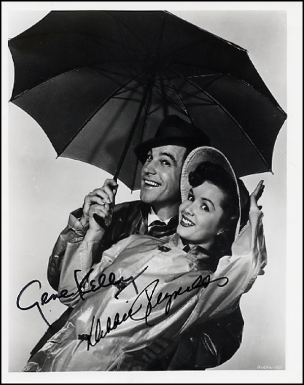 Glossy 8 x 10 photo of Gene Kelly and Debbie Reynolds as they appeared in Singin’ in the Rain, signed by both in black felt tip. In fine condition, with a trivial ding or two. R&R COA.