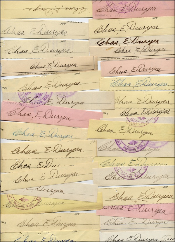 American inventor and manufacturer credited with inventing the first successful gasoline-powered automobile in 1893. Lot of thirty-two fountain pen signatures, “Chas. E. Duryea,” each approximately 5 x 1, all cut from the signature areas of checks of varying colors (majority are pale yellow). In overall fine condition, with a few lightly affected by bank stamps or cancellation holes, occasional smudge or feathering. COA John Reznikoff/PSA/DNA and R&R COA.