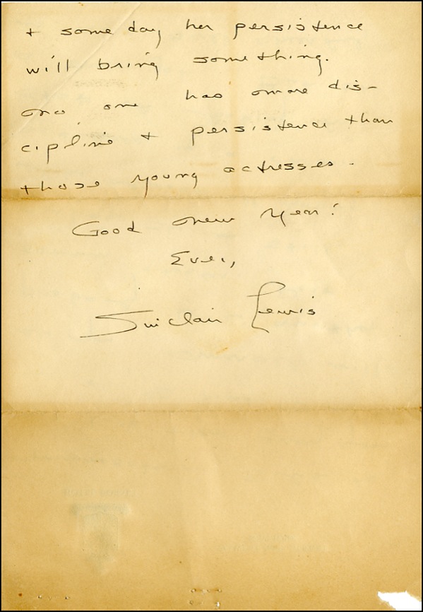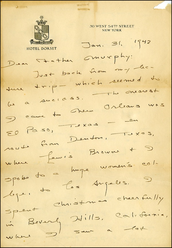 ALS, four pages two sheets, 7.25 x 10.5, Hotel Dorset, New York letterhead, January 31, 1942. Chatty letter to his friend, Father Murphy. In part: “Just back from my trip which seemed to be a success. I spent Christmas cheerfully in Beverly Hills, where I saw a lot of our friend, Cedric Hardwicke. Marcella will probably be in another summer theatre. Poor darling. She is still, like almost all young actresses, in a chronic state of looking for a new job.” In very good condition, with scattered toning, heavier at the folds and edges, a chip to upper right corner, staple holes to top border. R&R COA.