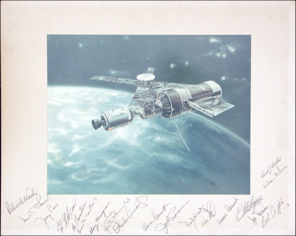 Impressive glossy 13.75 x 10.75 photo on a 20 x 16 mount, featuring an artist’s rendition of Skylab in orbit, signed in black ink by nineteen: Richard Truly, Alan Bean, Jerry Carr, Ed Gibson, W. Thornton, Bruce McCandless II, Story Musgrave, Rusty Schweickart, Charles Conrad, Owen Garriott, Jack Lousma, Paul Weitz, Don Lind, Vance Brand, Bill Pogue, Joe Kerwin, Bob Crippen, William B. Lenoir, and Karol J. Bobko. In fine condition, with toning from previous framing, scattered soiling and rubbing, and a few tiny spots. R&R COA.
