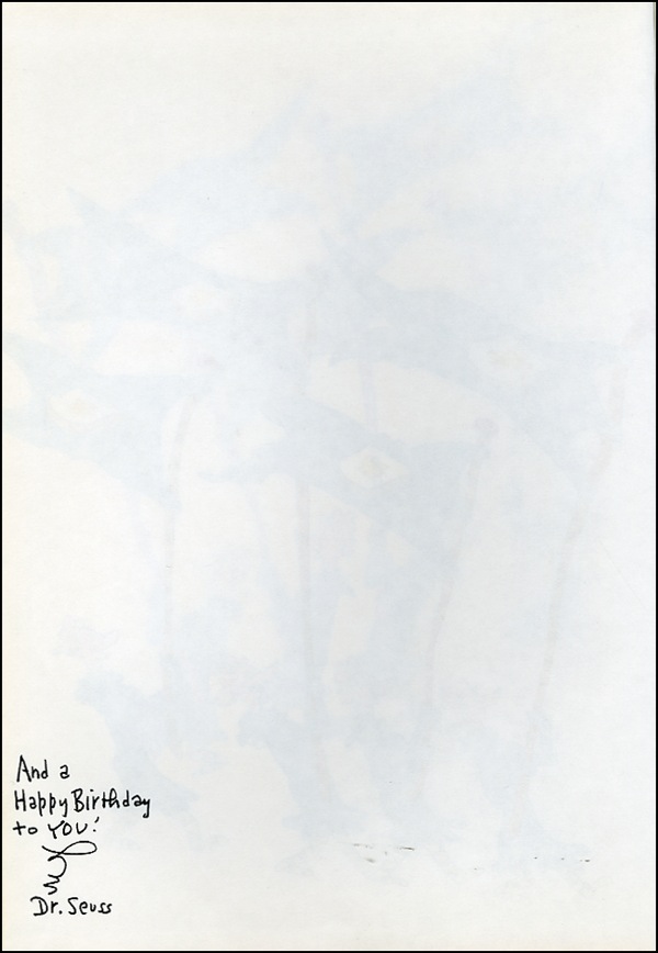 Signed book: The Butter Battle Book. NY: Random House, 1984. Hardcover, 8.5 x 11.5. Signed on the reverse of the first free end page, “And a happy birthday to you! Dr. Seuss.” In fine condition, with a few light scuffs to covers. R&R COA.