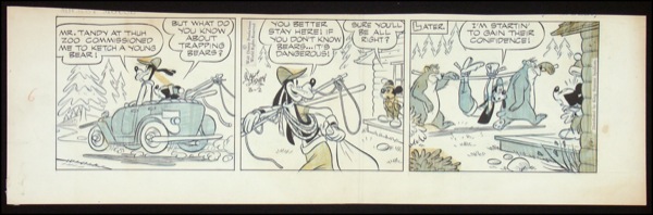 Original artwork for the daily Walt Disney comic strip Mickey Mouse, 20.75 x 6.5, March 2, 1957. The signature in the second panel is not in Disney’s own hand, but that of the strip’s inker. Accompanied by a copy of the original 1964 letter of transmittal on Walt Disney Productions letterhead, as well as a 2000 letter from the Disney Archives confirming the provenance and origin of this item in great detail. In fine condition, with two vertical folds, trimmed top edge, light soiling and toning, and scattered discoloration to applied shading medium. R&R COA.