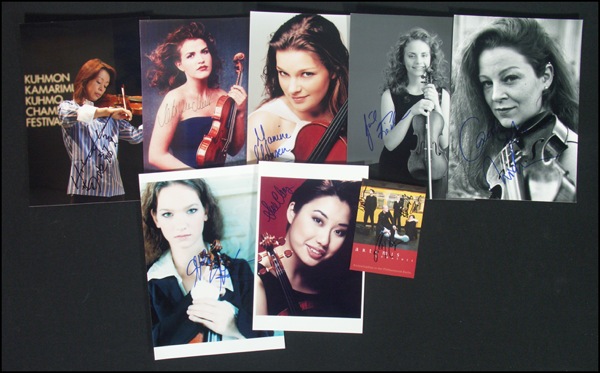 Terrific lot of eight glossy photos, most are color, ranging in size from 4 x 6 to 8.25 x 11.75, each signed in black or blue felt tip by the musician(s) pictured. Included: a promotional postcard depicting the Artemis Quartet; Sarah Chang, Hiromi Kikuchi, Anne Sophie Mutter, Janine Jansen, Julia Fischer, Carolin Widmann and Hilary Hahn. In fine condition. R&R COA.