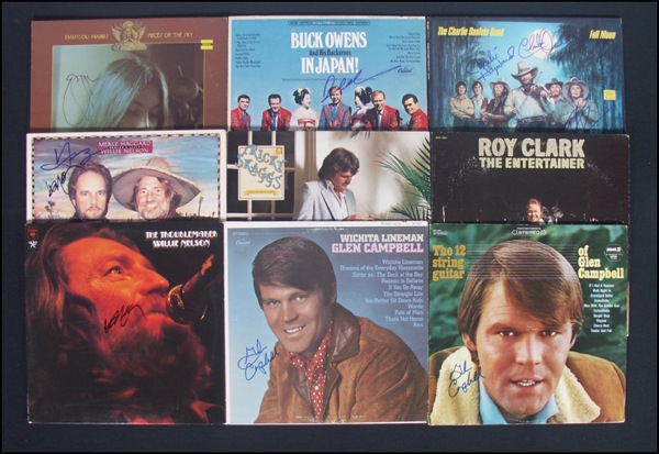 Lot of nine albums, each signed on the front cover in felt tip by the respective artist: Emmy Lou Harris, Buck Owens, Roy Clark, Ricky Scaggs, Merle Haggard and Willie Nelson, Glen Campbell (2), Willie Nelson and Charlie Daniels and Charlie Hayward. The records are included. In fine condition, with some light wear to a couple covers. R&R COA.