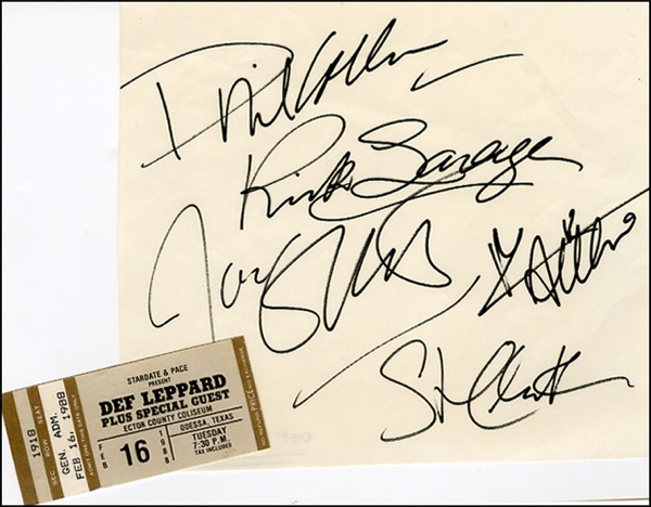 Felt tip signatures of Joe Elliot, Rick Allen, Phil Collen, Rick Savage and the late Steve Clark on an off-white 7.25 x 6.25 sheet. Accompanied by a ticket stub from their cancelled February 16, 1988 concert. In fine condition. R&R COA.