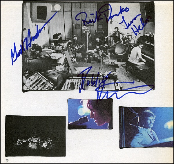 Inside album cover from one of their works, signed in blue felt tip by Robbie Robertson, Garth Hudson, Levon Helm and Rick Danko. In fine condition. R&R COA.