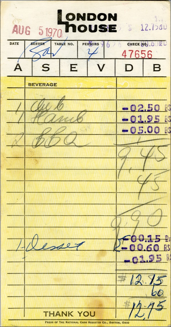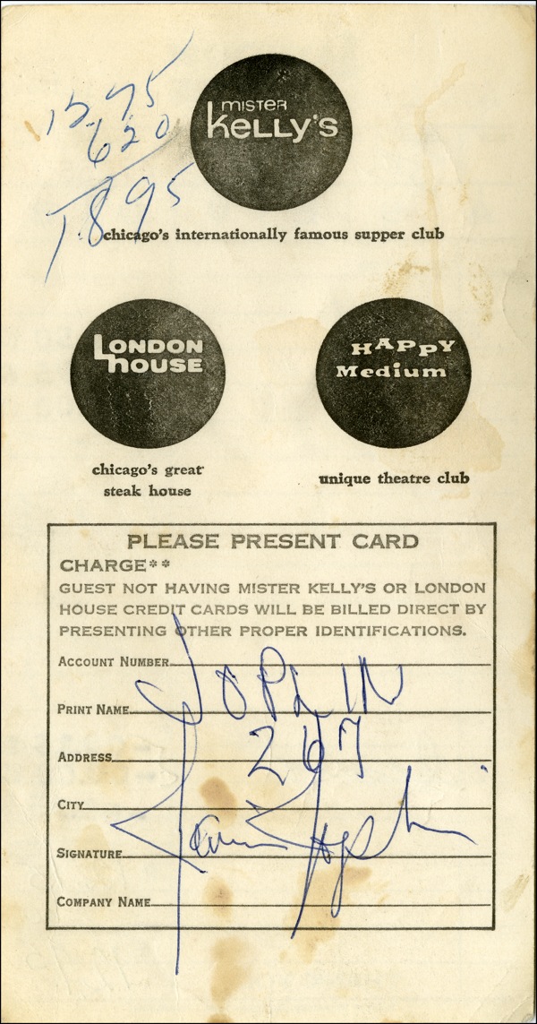 DS, one page both sides, 4.25 x 8, London House letterhead, August 5, 1970. Receipt for a four person luncheon at the London House in Chicago on August 5, 1970. Meal included a club sandwich, a hamburger and two bar-b-que, with one person enjoying dessert as well. Joplin prints her last name on the back, adds her room number, then signs in full just below, all in blue ballpoint. Receipt was signed just two days after one of Joplin’s last public appearances. She performed Half Moon and My Baby on the Dick Cavett Show on August 3, 1970. Joplin and Full Tilt performed on the night of August 5 at Ravina Park in Highland Park, Illinois. Less than two months later she would die of an accidental drug overdose. A few light spots over small porion of last name of signature, some light spotting and soiling to front and a few light surface creases, otherwise very good condition. COA Roger Epperson/PSA/DNA and R&R COA.