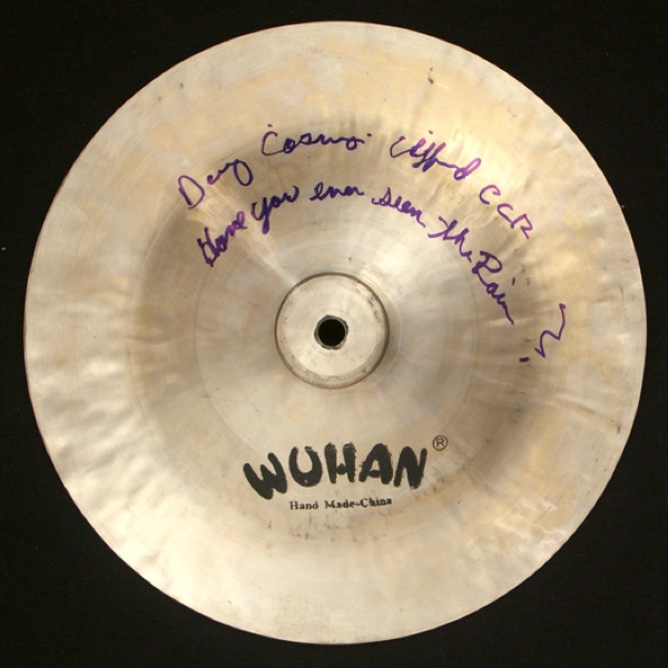 Nice 12” gold Wuhan cymbal, signed on the top in blue felt tip, “Doug Cosmo Clifford, CCR, ‘Have You Ever Seen The Rain.” In fine condition. R&R COA.
