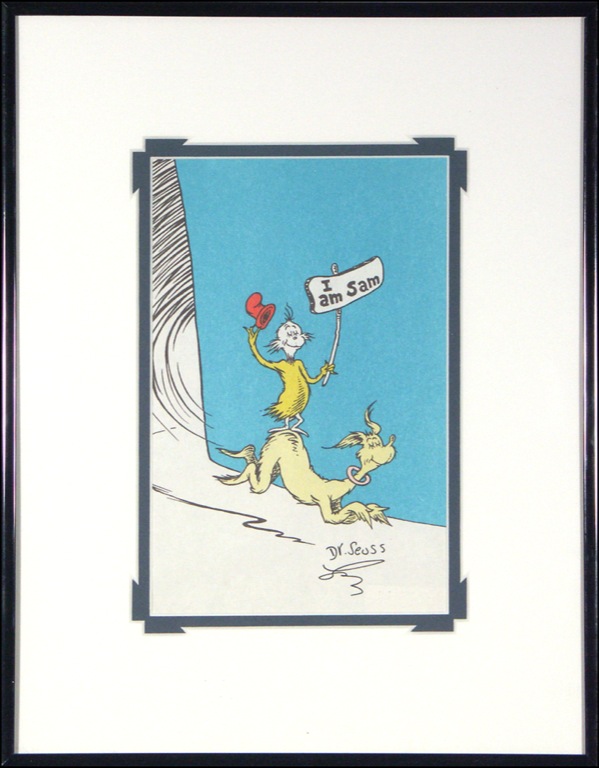 Color book page from Green Eggs and Ham, showing a great image of Sam, signed in black ink by Dr. Seuss. Double matted and framed to an overall size of 11.25 x 14.5. In very fine condition. R&R COA.