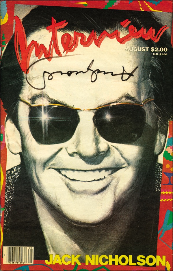 August 1984 edition of Warhol’s magazine Interview, 11 x 17, featuring Jack Nicholson on the cover, signed on the front cover in black felt tip by Warhol. In fine condition, with some mild handling wear. R&R COA.