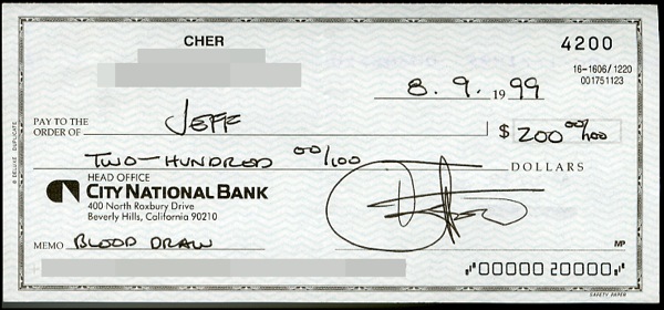 Cher pays for blood. Personal check, 6 x 2.5, filled out and signed by Cher, payable to Jeff for $200.00, August 9, 1999. Note in memo line reads, “Blood draw.” In fine condition, with a bisecting vertical fold, not affecting signature. R&R COA.