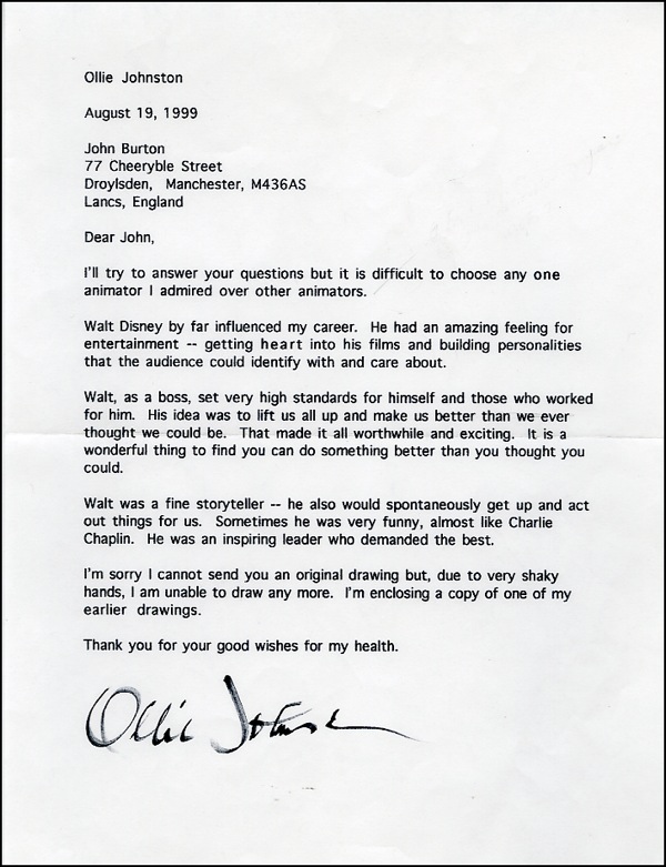 Animator and animation director who worked on a number of classic Disney productions, including Fantasia, Pinocchio, Bambi, and others. TLS, one page, 8.5 x 11, August 19, 1999. A response to a fan’s inquiry. In part: “Walt Disney by far influenced my career. He had an amazing feeling for entertainment—getting heart into his films and building personalities that the audience could identify with and care about. Walt, as a boss, set very high standards for himself and those who worked for him. His idea was to lift us all up and make us better than we ever thought we could be.” Accompanied by an unsigned photocopy of a handwritten postscript and two unsigned photocopies of drawings by Johnson. In fine condition, with usual mailing fold. R&R COA.