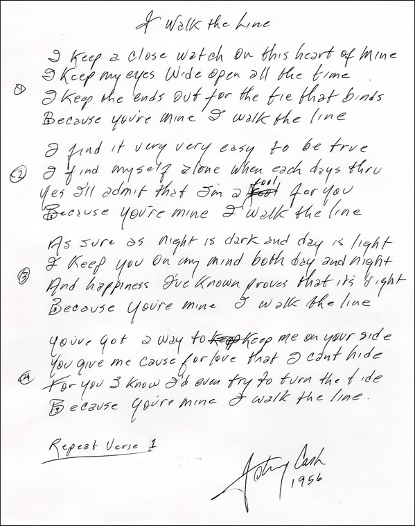 Complete set of hand-written lyrics to Cash’s hit I Walk The Line, on an 9 x 11 off-white sheet. Cash pens the four verses from the song, with the first verse reading, “I keep a close watch on this heart of mine; I keep my eyes wide open all the time; I keep the ends out for the tie that binds; Because you're mine, I walk the line.” Signed at the conclusion “Johnny Cash,” adding the date of the song “1956.” In fine condition. R&R COA.