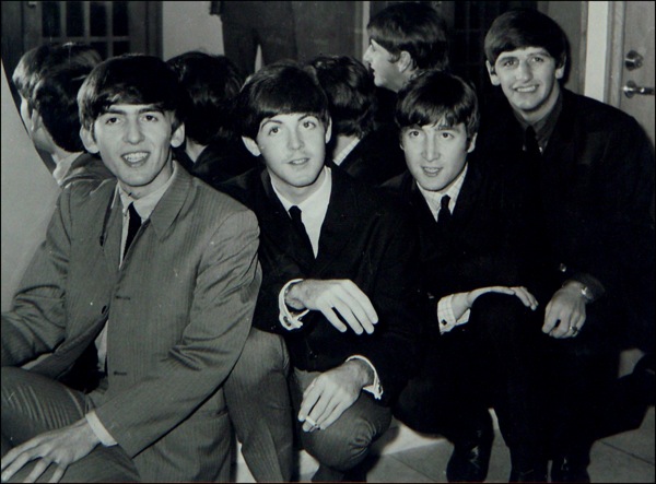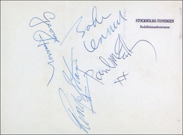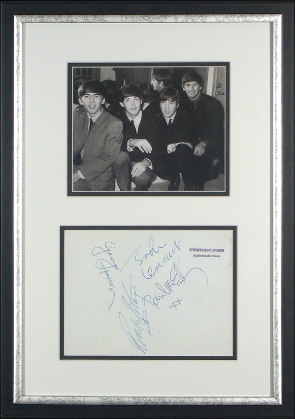 Fabulous vintage 8.5 x 6.5 photo of the Fab Four crouching down, stamped on the reverse by Stockholm’s daily newspaper (and presumably published), beautifully signed on the reverse in blue ballpoint, “George Harrison,” “John Lennon, “Ringo Starr,” and Paul McCartney xx.” All four signatures stand out not only for their clarity, but for their tremendous size. Perhaps the Fab Four were enjoying the famous Swedish hospitality (or attention of Swedish company) at the time of signing. One may never know, but can be glad the Beatles were in a good mood to provide this exceptional set of signatures. Photo is nicely double matted and framed, with glass on the reverse (so both sides are visible), with a reproduction of the image side, to an overall size of 15 x 21. In fine condition, with bold and very large signatures. Accompanied by a COA from Tracks, COA Roger Epperson/PSA/DNA and R&R COA.