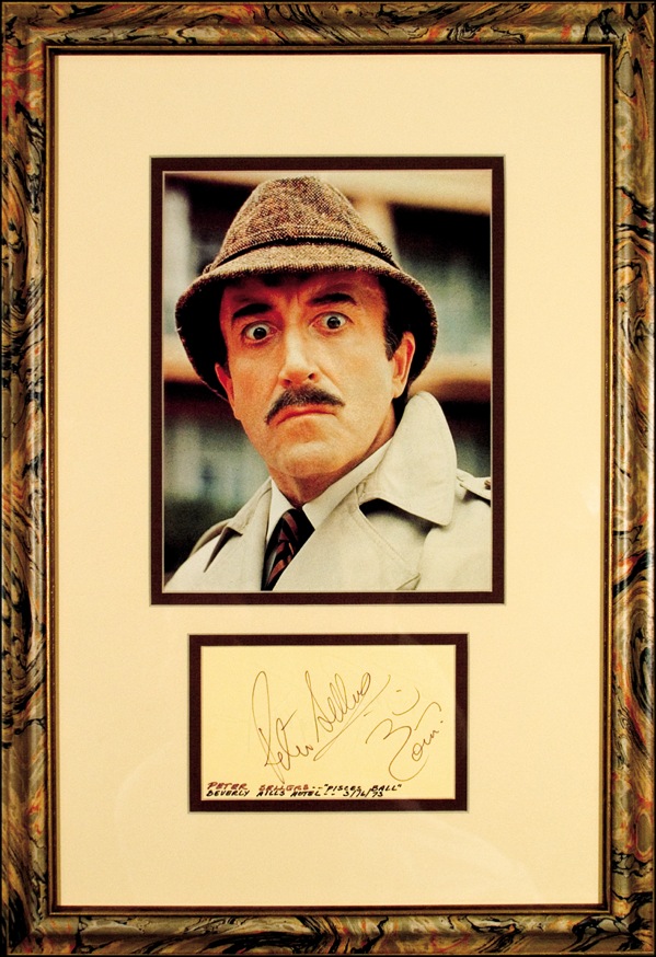 Felt tip signature, “Peter Sellers,” on a light yellow album page. Nicely double matted and framed with a color photo of Sellers as Inspector Clouseau, to an overall size of 14 x 20.5. In fine condition, with collector’s information along bottom edge and light show through from a signature on reverse. R&R COA.
