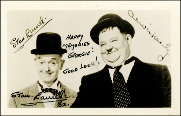 Vintage matte-finish 5.5 x 3.5 photo of the comedy duo with preprinted signatures, authentically signed and inscribed in black ink, “Happy memories Georgie! Good luck! Stan Laurel ’62.” In fine condition, with mild toning and soiling and a few brushes to inscription. COA PSA/DNA and R&R COA.