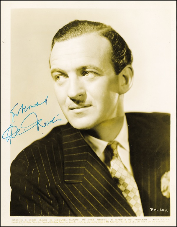 Vintage glossy 8 x 10 RKO publicity photo from 1939, signed and inscribed in fountain pen “For Howard, David Niven.” In fine condition, with some scattered light surface marks and impressions and a couple dings to left edge. R&R COA.
