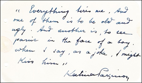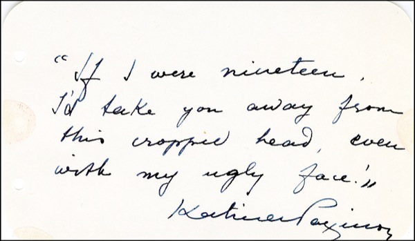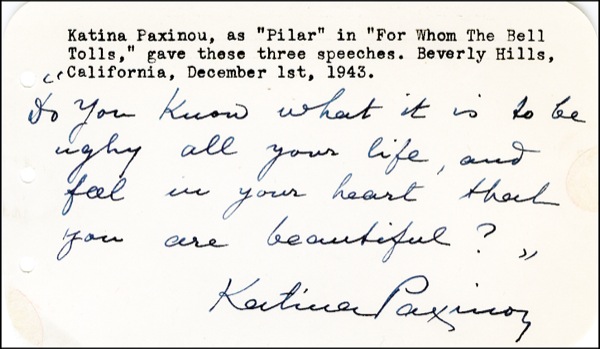 Lot of three different AQS on individual off-white 5 x 3 pages. Each quote is a line from Paxinou’s role as Pilar in the film version of Hemingway’s For Whom the Bell Tolls: “If I were nineteen, I’d take you away from this cropped head, even with my ugly face”; “Do you know what it is to be ugly all your life, and feel in your heart that you are beautiful?”; and “Everything tires me. And one of them is to be old and ugly. And another is to see panic in the face of a boy, when I say, as a joke, I might kiss him.” R&R COA.