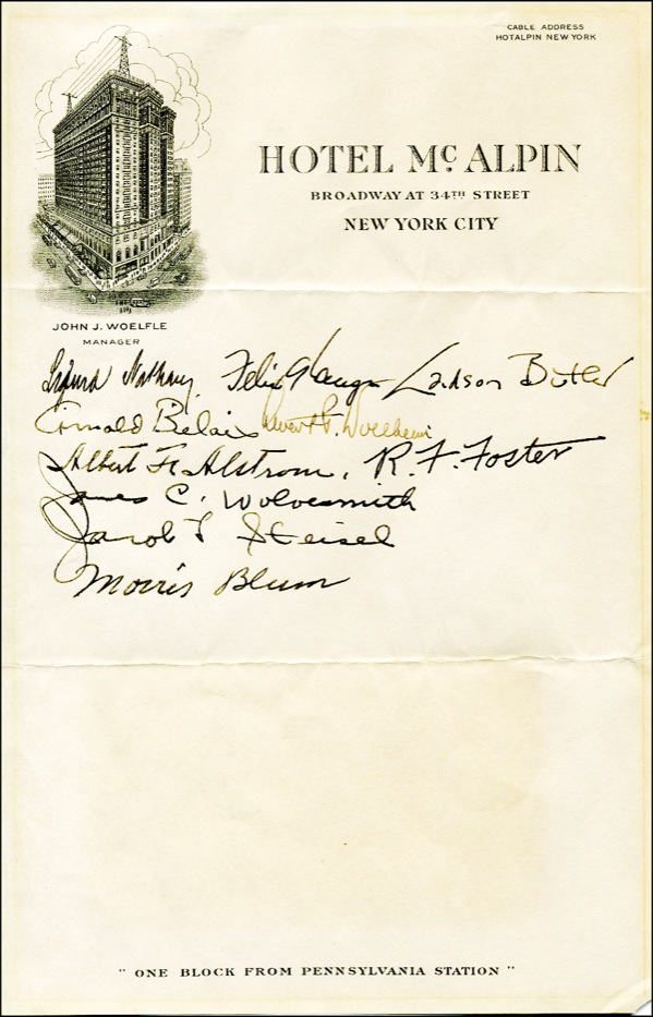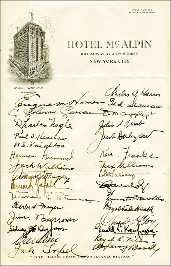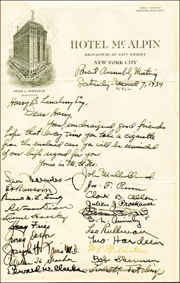 Fountain pen signatures of sixty-one magicians on three off-white 6 x 9.25 sheets of Hotel McAlpin stationery, dated April 7, 1934. At the top of the first page is a short ALS, written to fellow magician Harry B. Linaberry from acclaimed magician John Mulholland, which reads, “Your undesigned good friends hope that every time you take a cigarette from the enclosed case you will be reminded of our high regard for you. Yours in M[agic] U[nity] M[ight].” Signed at the conclusion by Mulholland, as well as sixty other magicians, including: Theo Hardeen (Houdini’s brother), Cardini, Harry Fries, Irving Desfor (professional AP photographer who is world famous among magicians for the many outstanding professional photos he took of early magicians), Joseph H. Fries, Edward W. Clarke, Clark B. Allen, Julien J. Proskauer (a well-known amateur magician and psychic investigator known as “Psycho.” He wrote the book “Spook Crooks” in 1932 and The Dead Do Not Talk.” He was the club President (1935-36), A. L. Quimby, W. R. Williston, Bob Sherman, Eugene M. Homer, Paul J. Henshaw, W. S. Knighton, Herman Kimmel, Jack Williams, Warren E. Simms, Herbert Meyer, Charles Harris, Ken Franke, Max Williams, Albert Alstrom, Joseph Fries, Charles Nagle, Gerald Haifmann, Bernard Zyfall, Jack Trepel, Morris Blum and R. F. Foster. The Parent Assembly of the Society of American Magicians is in Assembly #1 in New York City. It is #1 because The Society of American Magicians was founded on May 10, 1902 in Martinka's famous magic shop in New York City. Assembly #1, therefore, makes the SAM the oldest and most prestigious magical society in the world. In fine condition, with mild toning, two horizontal mailing folds to each page and a small tape remnant to the reverse of each page. R&R COA.