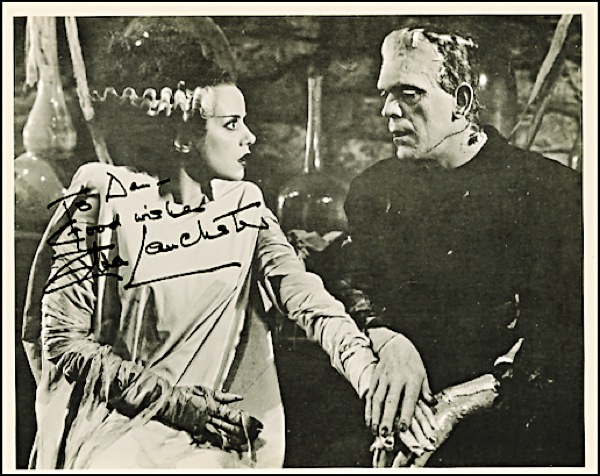 Classic 10 x 8 photo of Lanchester as the object of Karloff’s attention in The Bride of Frankenstein, signed and inscribed in black felt tip “To Dan, Good wishes, Elsa Lanchester.” In fine condition. R&R COA.