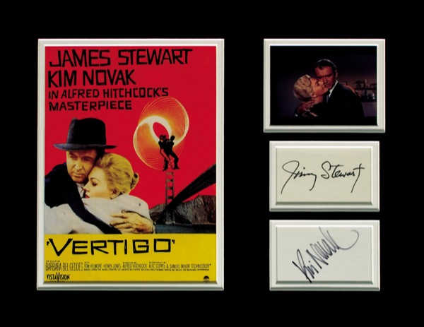 Felt tip signatures, “Jimmy Stewart” and “Kim Novak,” on individual off-white cards. Both are double matted with a color photo of the two from Vertigo and a color 7 x 10.5 mini poster, to an overall size of 18 x 14. In fine condition. R&R COA.