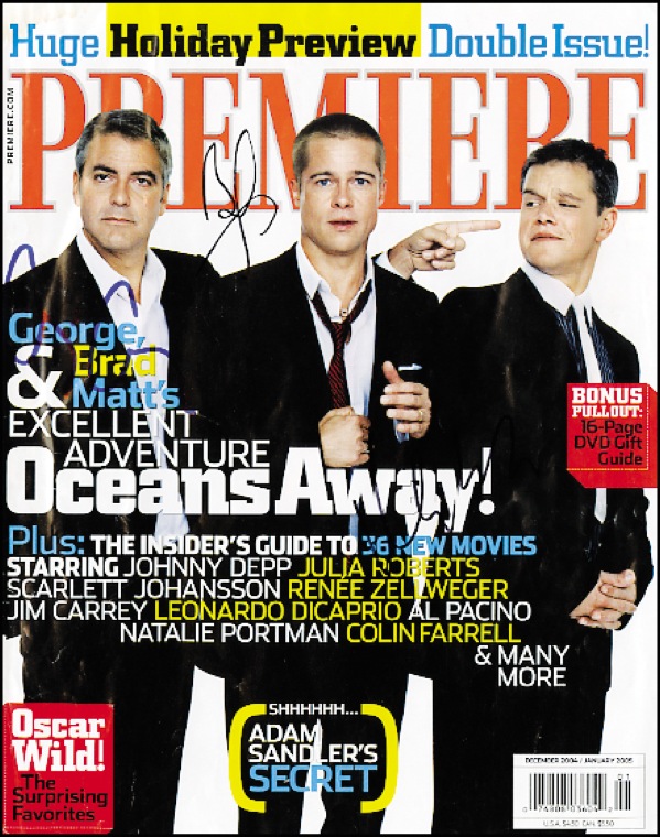 Magazine cover from the December/January 2005 issue of Premiere magazine, signed on the cover in blue felt tip by George Clooney and in black felt tip by Brad Pitt and Matt Damon. In fine condition, with some scattered light wrinkling. R&R COA.