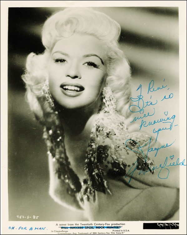 Fabulous vintage glossy 8 x 10 promotional portrait of Mansfield wearing a low-cut, sequined sweater and dangling rhinestone earrings, in a scene from 1957’s Will Success Spoil Rock Hunter?, signed and inscribed in blue ballpoint “To Rene, It’s so nice knowing you - Jayne Mansfield.” In fine condition, with a brief ink notation in another hand in the lower left margin, scattered surface impressions, two small tears in the left margin repaired on the reverse, crease to lower left corner. COA PSA/DNA and R&R COA.