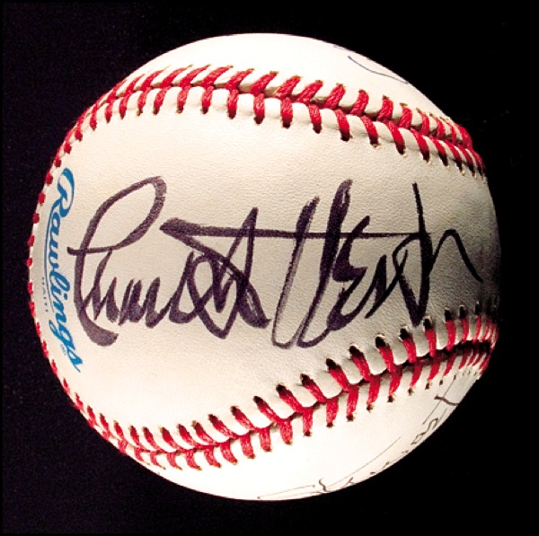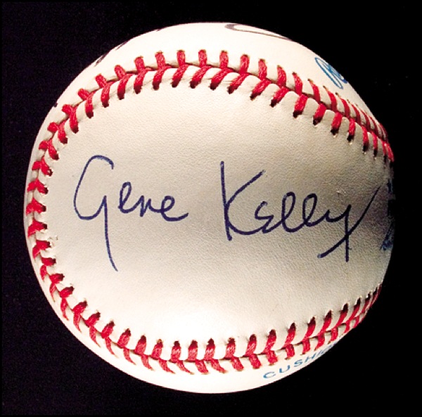Official Rawlings American League baseball signed in ballpoint on different side panels by James Stewart and Gene Kelly and in black felt tip by Charlton Heston. In fine condition. R&R COA.