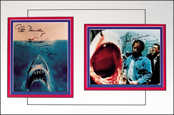 Color glossy 8 x 10 photo of a shark getting ready to dine, signed in black felt tip by Peter Benchley, adding a small shark sketch; and a color glossy 10 x 8 photo from the film, signed in black felt tip by John Williams. Both are triple matted to an overall size of 24 x 16. In fine condition. R&R COA.
