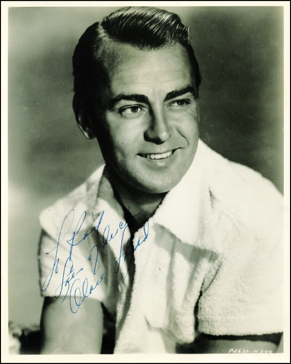 Vintage matte-finish 8 x 10 portrait of the smiling actor in a white terrycloth shirt, signed and inscribed in blue ballpoint “To Ray, Lots of luck, Alan Ladd.” In fine condition. R&R COA.