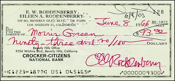 Personal check, 6 x 2.75, filled out and signed by Star Trek: Roddenberry, Gene, payable to Morris Green for $93.00, June 8, 1966. In fine condition, with usual cancellation holes. R&R COA.