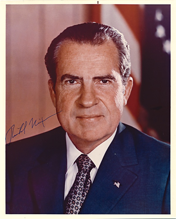 Handsome color satin-finish 8 x 10 photo of a smiling Nixon, probably as President, signed in blue ink. In fine condition, with faint and unobtrusive vertical bend. R&R COA.