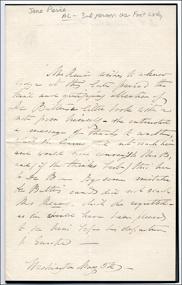 Wife of President Franklin Pierce and First Lady from 1853 to 1857. Unsigned letter in her hand, evidently as First Lady, 4.25 x 7, May 5. A note of thanks on behalf of her husband. In part: “Mr. Pierce wishes to acknowledge at this late period the kind and gratifying attention of Dr. Batters—a little book with a note from himself—& he entrusted a message of thanks to another, which he learns did not reach him and would now convey…. By some mistake Dr. Batters’ card did not reach Mr. Means [?]—which he regretted—as he would have been pleased to see him before his departure to Europe.” In fine condition, with usual mailing folds and penciled collector’s notations. COA John Reznikoff/PSA/DNA and R&R COA.
